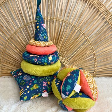 Les textures variées des tissus encouragent la motricité et la découverte tactile.
